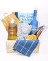 GIFT INCLUDES: Wooden Reusable Gift Box; Kosterina Olive Oil; Wooden Cutting Board; Garlic Press; Apron; Blue Zones Book; Kitchen Towel; Lemon Verbena Hand Soap; Dried Foliage.